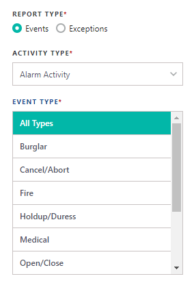 The Activity Report Search panel generates alarm and test activity results for events and exceptions that occur at your site, outside of a site's normal daily activities. There are two types of activity reports that can be created; Activity Events and Activity Exceptions. Generating the Activity Events report populates various alarm & test activities that occur at your site, and the Alarm Activity Exception report renders activities that occur outside of normal activity (e.g. notify PD, notify FD, etc.). For each report type, you would select the desired activity type to include in the results.