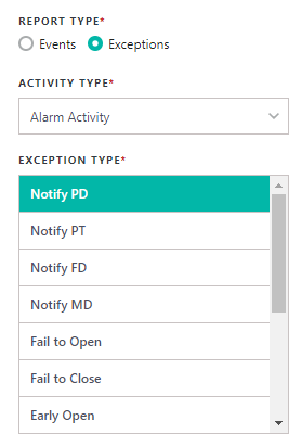 Exceptions display the activity events by Alarm Activity, Test Activity or both. You must select the exception type(s) you wish to run reports on, including Notify PD/PT/FD/MD, Failure to Open/Close, Early or Late Open/Close, Bypass Zone, Call Customer and Timer Test Failure.