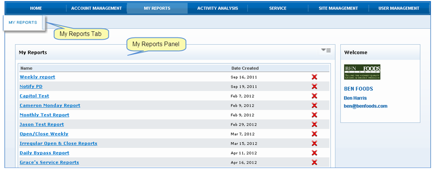 The benefit in using the My Reports section is to save recurring searches that you would routinely run in DataSource. For example, a large company may be required to run a report for alarm activities that occurred within the past 24 hours for all sites. By initially creating and saving the search criteria, you can quickly access the search criteria to generate the report on a daily basis because it would be saved in the My Reports section. Smaller companies may want to generate an Open/Close report to monitor the actual times the site location was disarmed and armed. The report will show the dates and time of when the activity occurred, along with the user who activated and/or deactivated the site systems.
