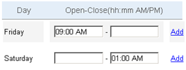 The following example shows a site opening at 9:00 AM on Friday and closing at 1:00 AM on Saturday.