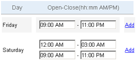 Each day that has an Open time interval must have a Close time interval, even if the close time occurs after midnight. Adding a time slot allows you to enter an open time on the day before the site closes.