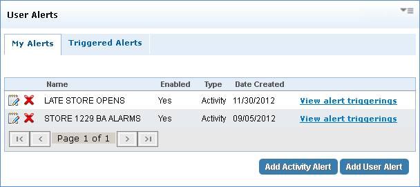 The My Alerts section contains the User Alerts panel which manages user-specific activity & user alerts, and notifies you of any problems with your sites or users. Within the My Alerts tab, you can view, edit, and delete activity & user alerts. The Triggered Alerts tab displays alerts that produced an outcome based on the value (number of days) entered when creating the alert. In addition, you are notified by triggered alerts through email; triggered alerts appear in the Notifications Dashboard and saved in the alert history.