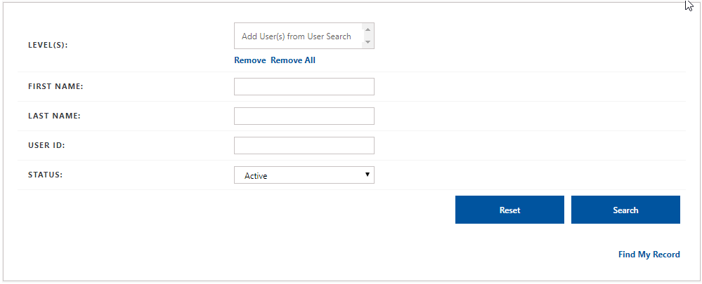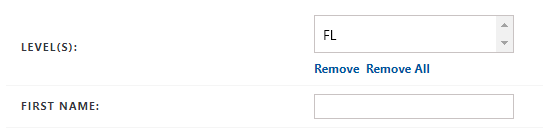 The site level appears in the Level(s) field in the User Search panel. To remove a site level, select the site and click Remove. To remove all site levels in the Level(s) field, click Remove All.