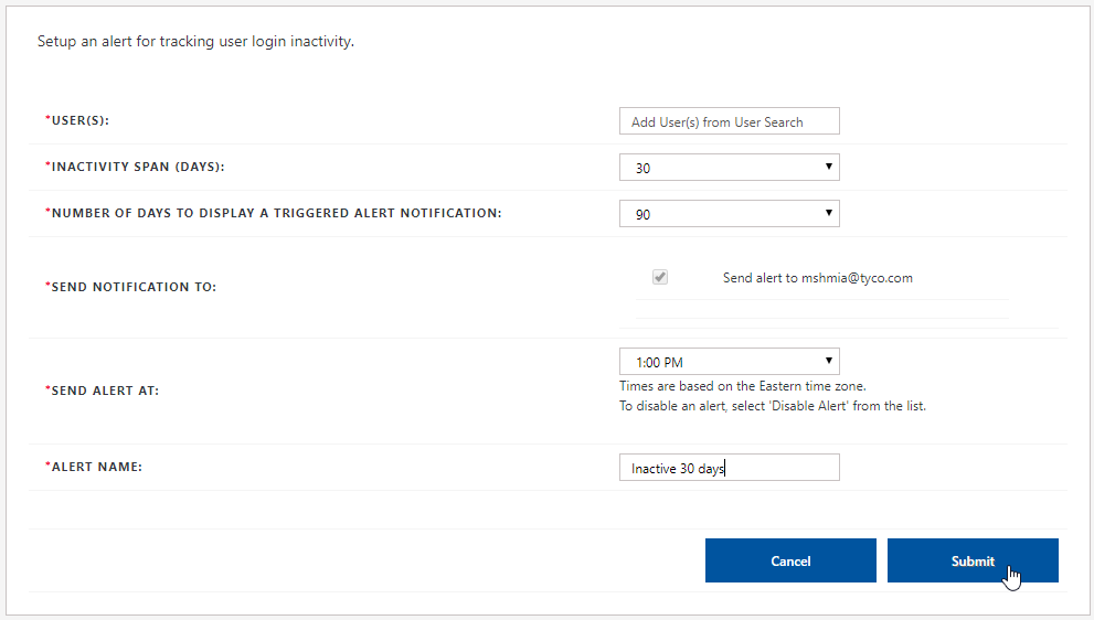 Select the value (number of inactive days) you want for the alert from the Inactivity span (days) drop-down list.
