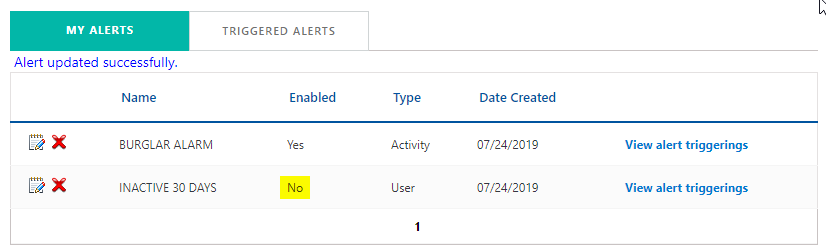 Administrators and users can enable and disable activity and users alerts from the Edit User Alert screen.