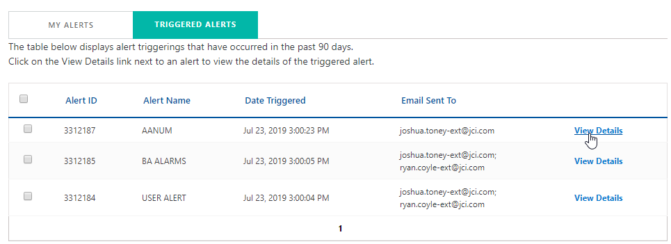 Click the Triggered Alerts link to display the Triggered Alerts tab in My Alerts.